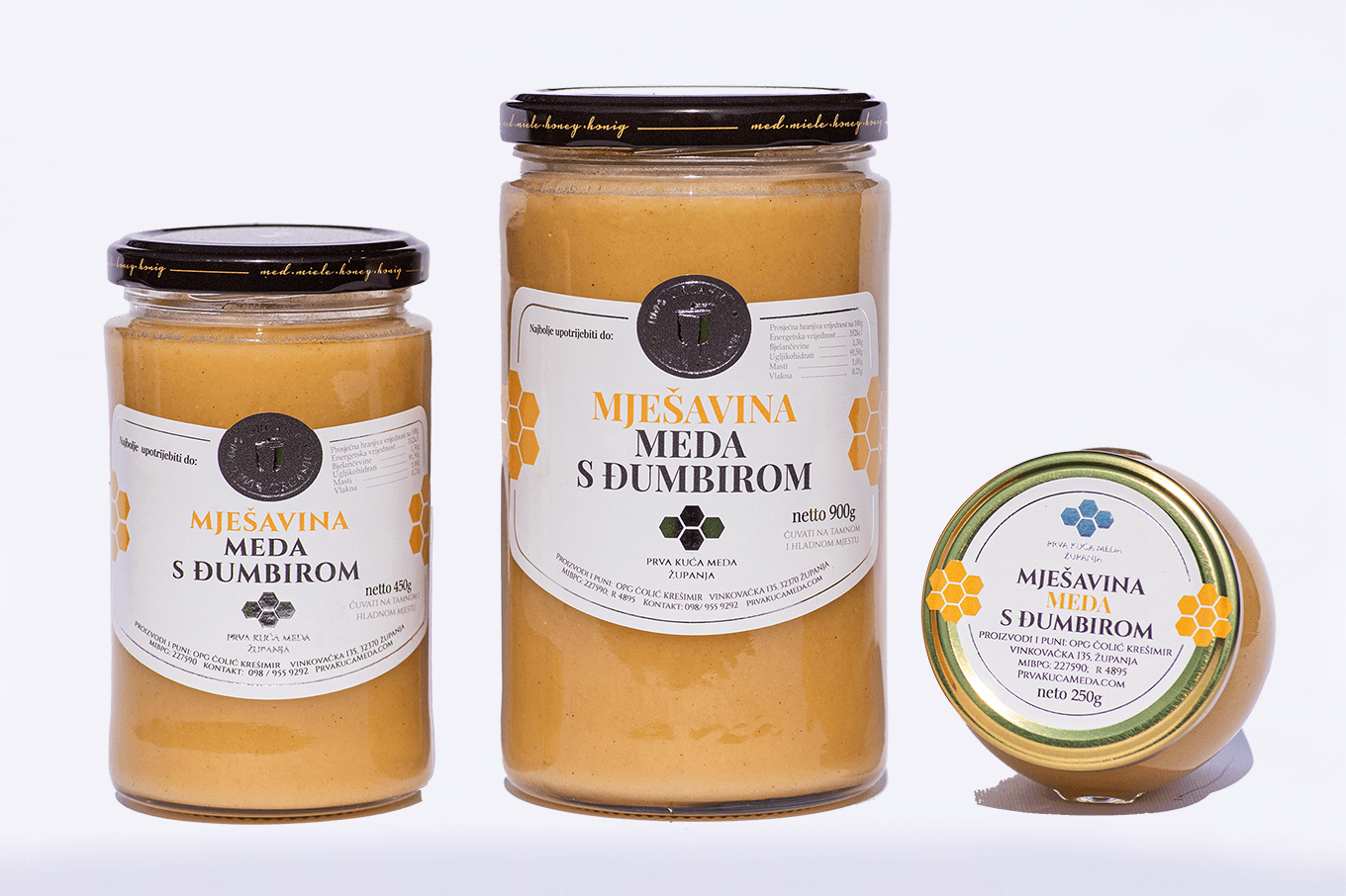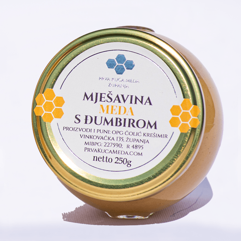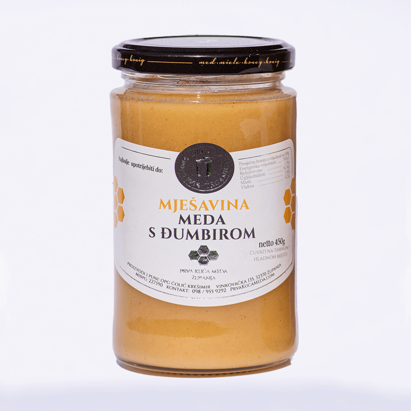 Mješavina meda s đumbirom izvrsna je kombinacija okusa i zdravih sastojaka. Aromatičnog je okusa i mirisa. Đumbir se stoljećima koristi kao začin, ali i kao djelotvoran lijek. Osim što djeluje antioksidativno, višestruko je učinkovit kod povišenog kolesterola. Smiruje nervozan želudac, pomaže kod mučnina i sprječava nadutost. Koristi se za prevenciju gripe i prehlade jer jača imunitet i time jača organizam u borbi protiv bolesti. Učinkovit je protiv upornog kašlja i simptoma prehlade, pomaže kod smanjena tegoba reumatoidnog artritisa, smanjuje stres i otklanja napetost.